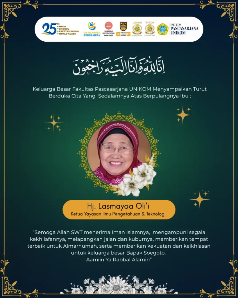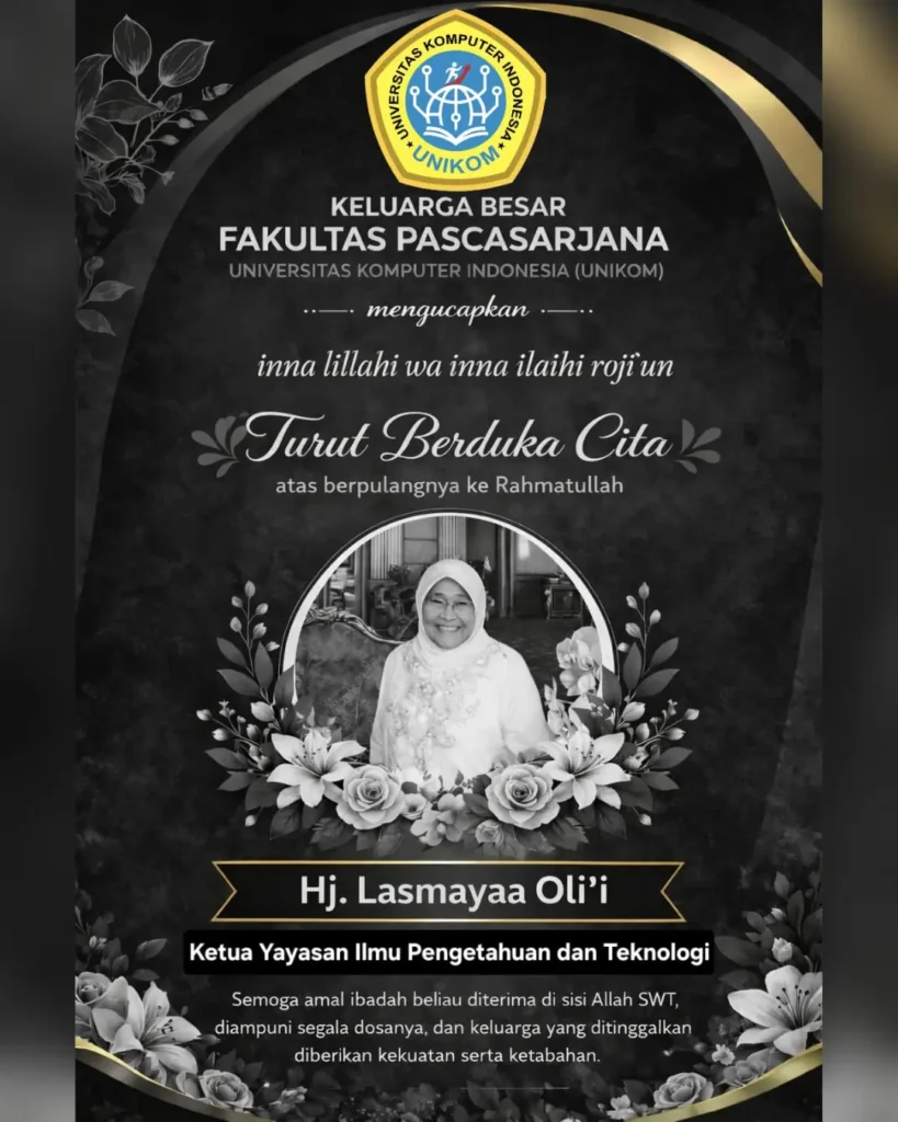 Keluarga Besar Fakultas Pascasarjana Universitas Komputer Indonesia (UNIKOM) menyampaikan turut berduka cita yang sedalam – dalamnya atas berpulangnya ibu Hj. Lasmayaa Oli’i, Ketua Yayasan Ilmu Pengetahuan dan Teknologi
